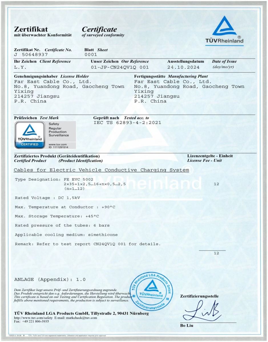 该产品获得了莱茵TV在国内颁发的首张液冷充电桩电缆产品认证证书,和UL认证。还通过了耐高温制冷剂腐蚀测试,具备优秀能力的抗爆破、耐气候、抗UV测试、耐低温等特性,保障充电安全。